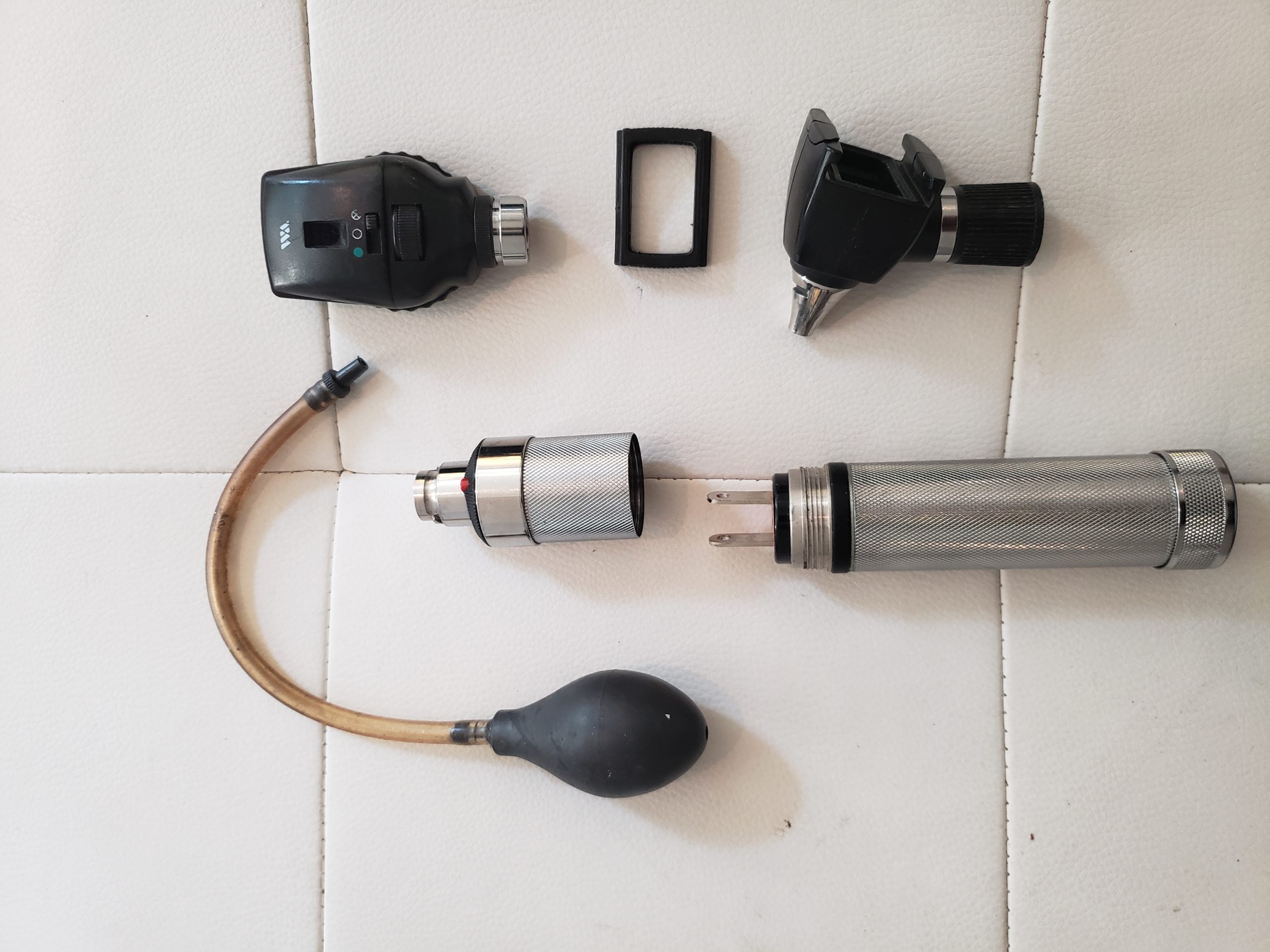 Diagnostic Set of Standard Ophthalmoscope and  Pneumatic Otoscope with NiCd Handle used by health practitioners for eye and ear medical diagnosis of disease.